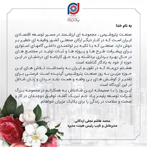 این روز را با صمیمانه ترین شادباش به همکارانم در مجموعه بزرگ شرکت توسعه پلیمر پادجم تبریک گفته، توفیق دوچندان در کار و صحت و سلامت در زندگی را برای یکایک عزیزان خواهانم.
